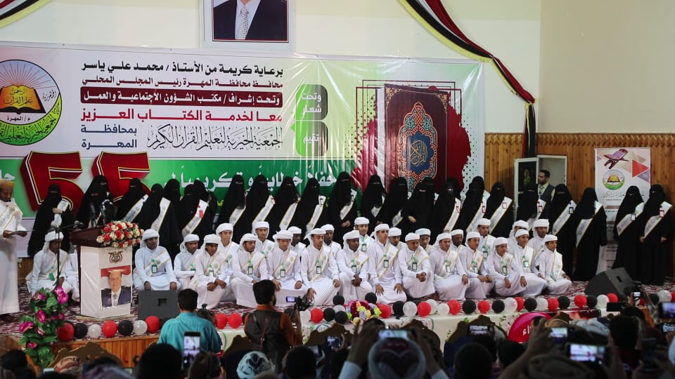 نظمت الجمعية الخيرة لتعليم القرآن الكريم بمحافظة المهرة، اليوم الاثنين، حفل خطابيا وتكريما لـ 55 حافظا وحافظة من طلاب المراكز القرآنية، برعاية كريمة من محافظ المهرة رئيس المجلس المحلي الأستاذ محمد علي ياسر، وحضور أمين عام المجلس المحلي، سالم عبدالله نيمر، وتحت إشراف مكتب الشؤون الاجتماعية والعمل بالمحافظة.