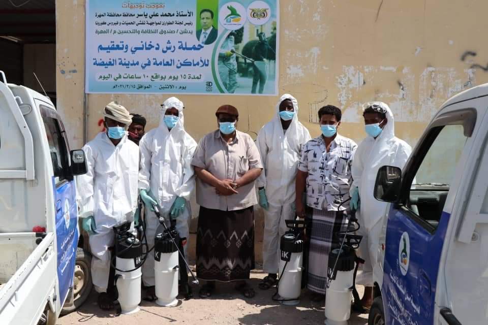 دشن صندوق النظافة والتحسين بمحافظة المهرة، اليوم الاثنين، حملة رش دخاني وتعقيم للأماكن العامة في مدينة الغيضة.