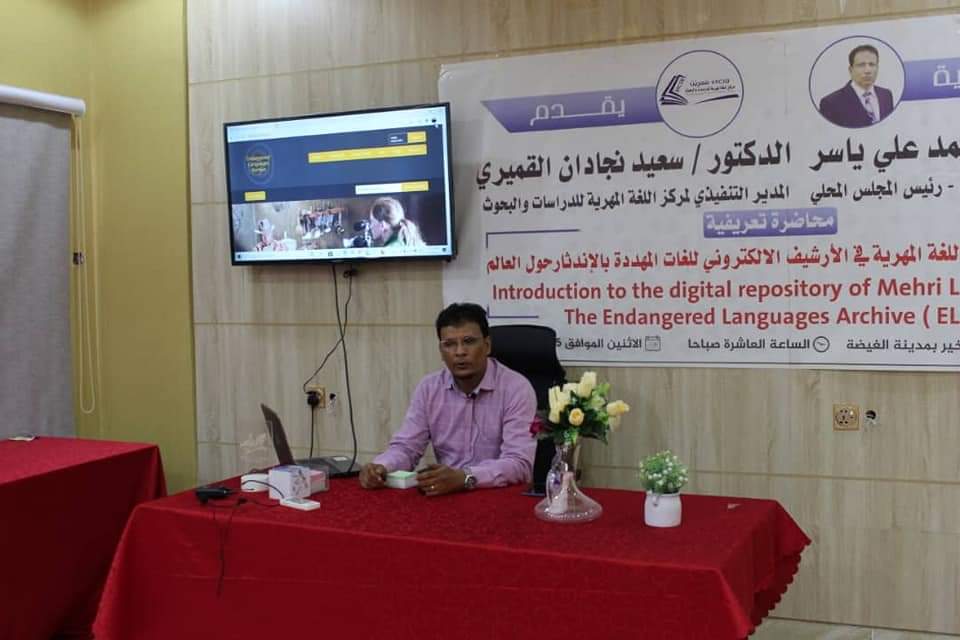 قدم صباح يوم الأثنين ، بقاعة مؤسسة فينا خير للتنمية والأعمال الإنسانية، الدكتور سعيد نجادان القميري المدير التنفيذي لمركز اللغة المهريۃ للدراسات والبحوث بالمحافظة محاضرۃ حول المخزن الرقمي للغة المهريۃ ضمن الأرشيف الدولي للغات المهددۃ بالإندثار حول العالم·