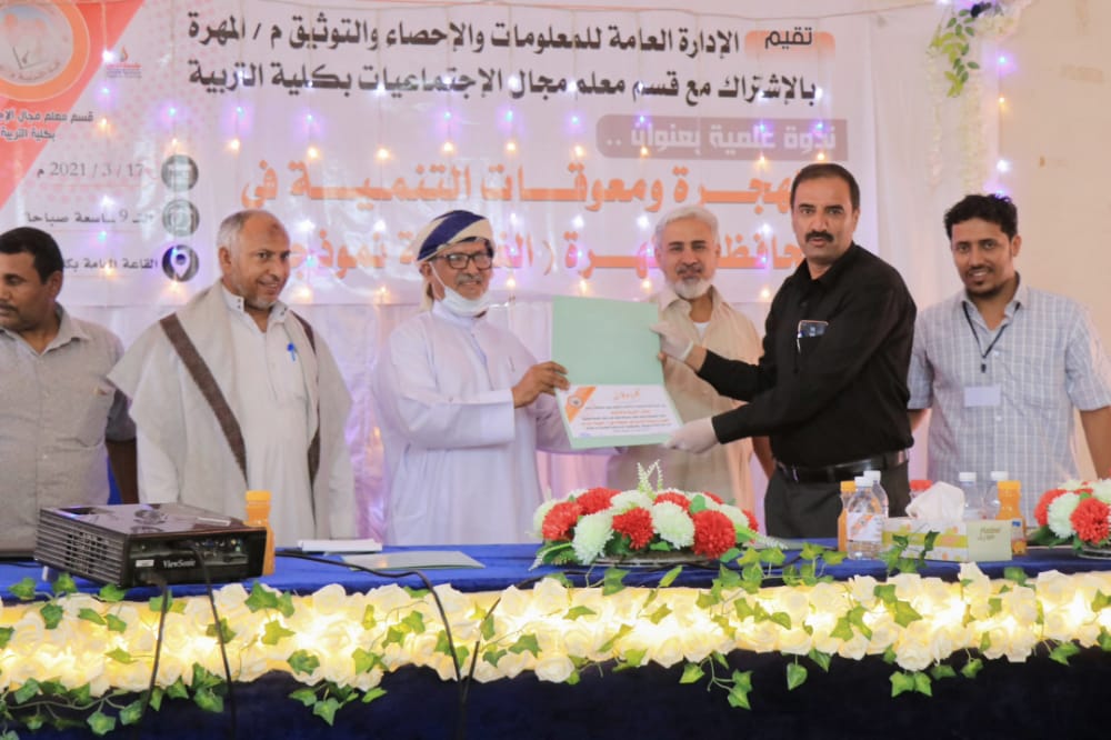 أقامت الادارة العامة للمعلومات والإحصاء والتوثيق بمحافظة المهرة، اليوم، بالشراكة مع قسم معلم مجال الاجتماعيات بكلية التربية ندوة علمية بعنوان الهجرة ومعوقات التنمية بالمحافظة ” الغيضة نموذجاً”، برعاية الأستاذ محمد علي ياسر محافظ المحافظة وبتمويل السلطة المحلية بالمحافظة.