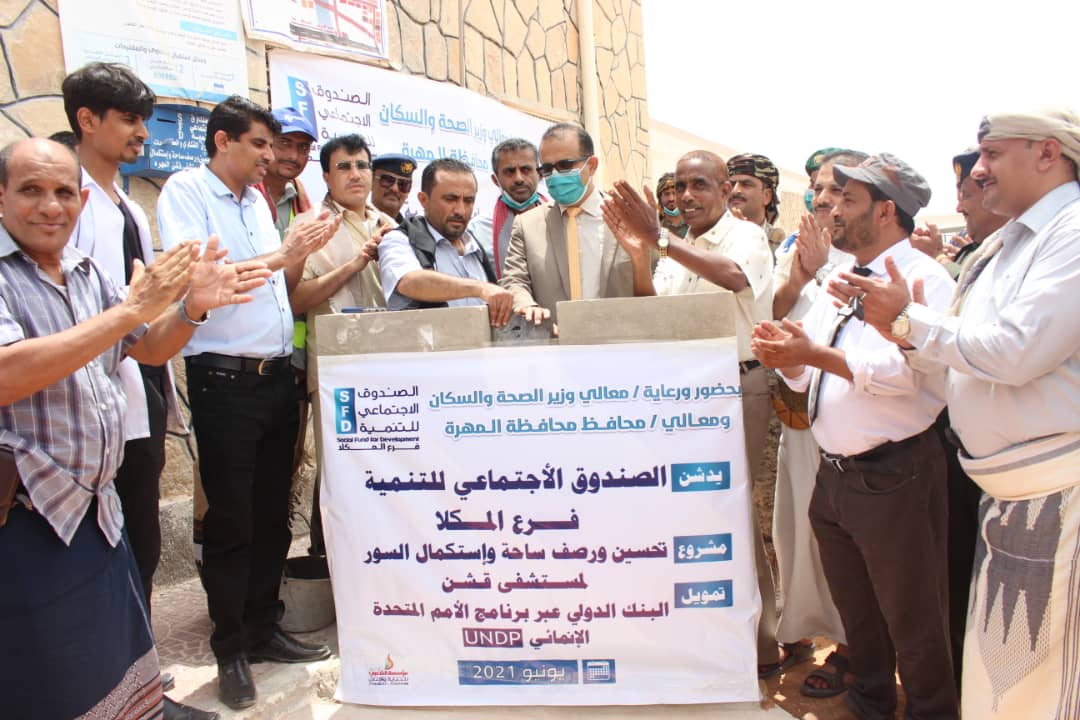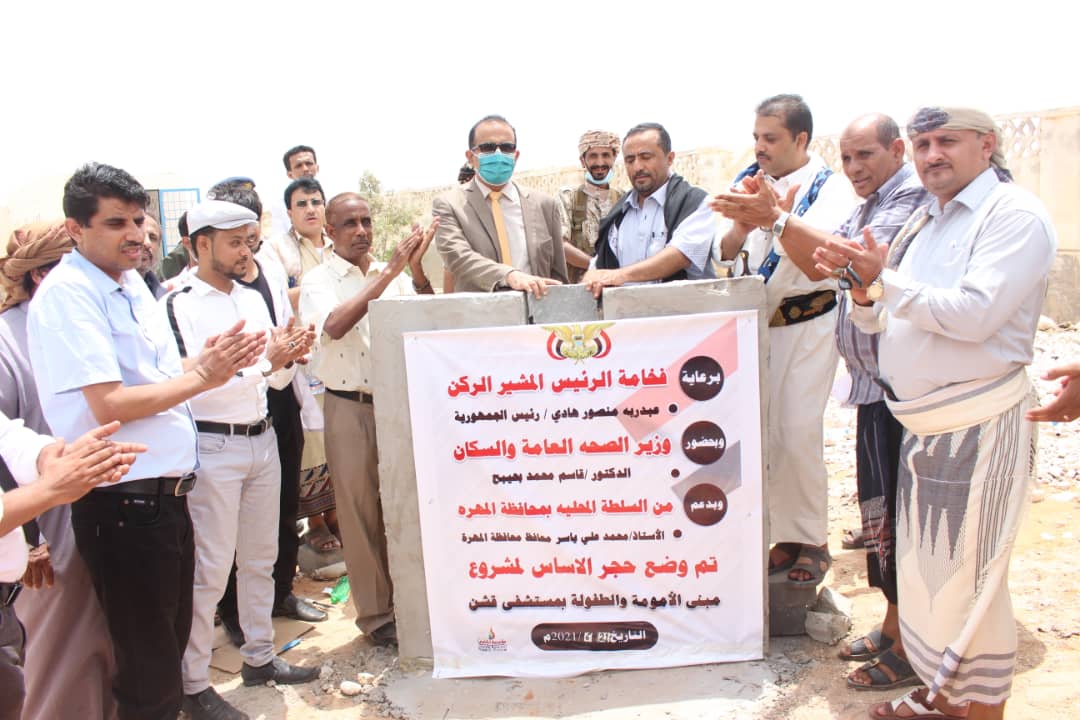 وضع وزير الصحة العامة والسكان الدكتور قاسم محمد بحيبح، اليوم، بحضور مدير عام مكتب الوزارة بمحافظة المهرة الدكتور عوض مبارك سعد ومدير عام مديرية قشن الشيخ فيصل بن حازم الجدحي، حجر الأساس لمشروع مبنى الأمومة والطفولة بقشن بتمويل من السلطة المحلية بالمحافظة ، ومشروع تحسين ورصف ساحة واستكمال سور مستشفى قشن بتمويل من البنك الدولي عبر برنامج الأمم المتحدة الإنمائي وتنفيذ الصندوق الإجتماعي للتنمية.