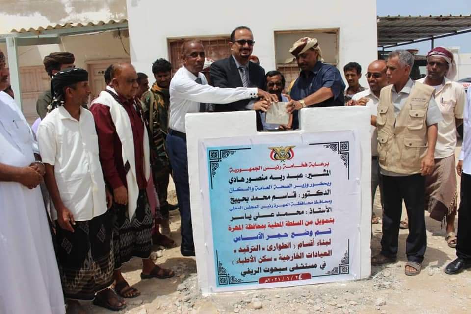 قام معالي وزير الصحة العامة والسكان الدكتور قاسم محمد بحيبح اليوم ، ومعه مدير عام مديرية سيحوت الشيخ محمد أحمد الزويدي ومدير عام مكتب الصحة والسكان بالمحافظة الدكتور عوض مبارك سعد، بوضع حجر الأساس لبناء أقسام ( الطوارئ والترقيد والعيادات الخارجية وسكن الأطباء) لمستشفى سيحوت الريفي بتمويل من السلطة المحلية بالمحافظة تحت رعاية فخامة رئيس الجمهورية المشير عبدربه منصور هادي ومحافظ محافظة المهرة الأستاذ محمد علي ياسر.