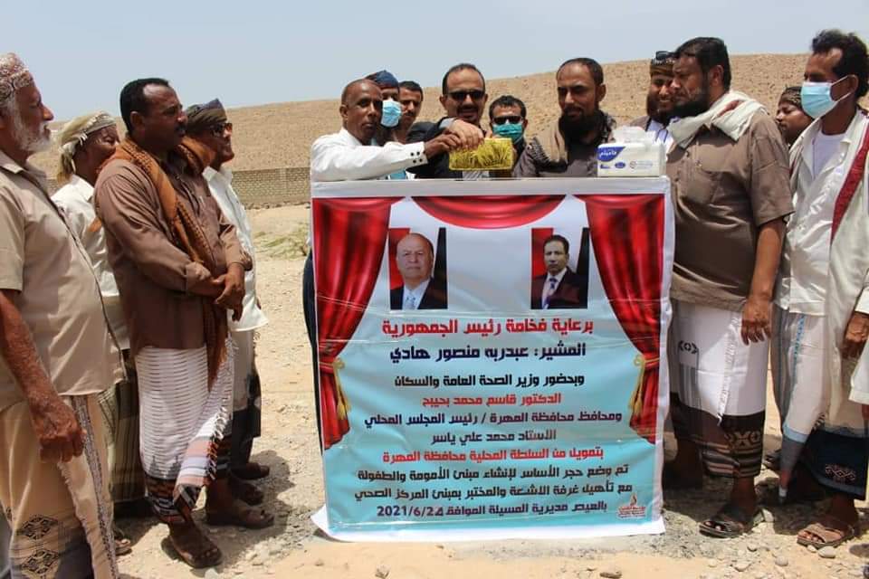 وضع معالي وزير الصحة العامة والسكان الدكتور قاسم محمد بحيبح اليوم، ومعه مدير عام مكتب الصحة والسكان بالمحافظة الدكتور عوض مبارك سعد وأمين عام المجلس المحلي بمديرية المسيلة عبدالرحمن باعبّاد ، حجر الأساس لإنشاء مبنى الأمومة والطفولة وتأهيل أقسام الأشعة والمختبر في مركز المسيلة الصحي بتمويل من السلطة المحلية بالمحافظة تحت رعاية فخامة رئيس الجمهورية المشير عبدربه منصور هادي والأستاذ محمد علي ياسر محافظ محافظة المهرة.