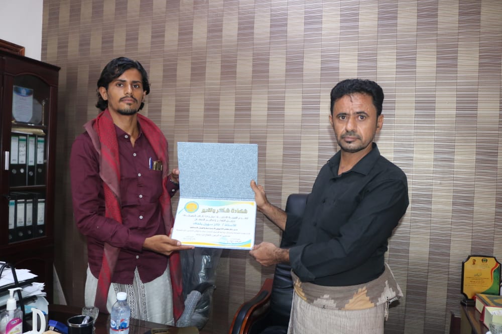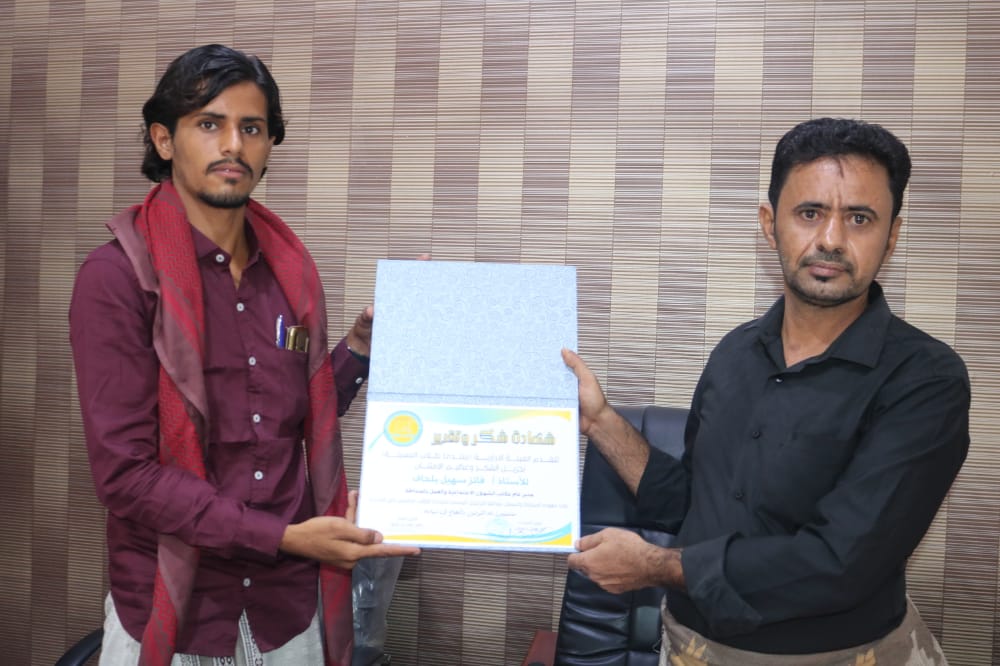 كرمت الهيئة الإدارية لمنتدى طلاب مديرية المسيلة، مدير عام مكتب الشؤون الاجتماعية والعمل الأستاذ فائز بلحاف بشهادة شكر وعرفان تقديراً لجهوده تجاه المنتدى وتقديم الدعم والاهتمام والتسهيلات لتنفيذ خططه وبرامجه.