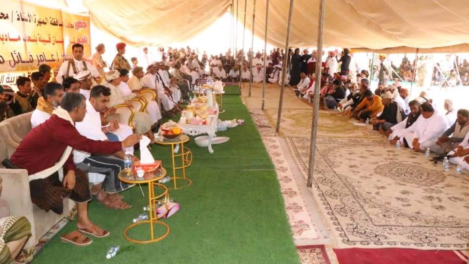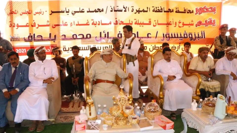 أقام شيوخ وأعيان قبيلة بلحاف في محافطة المهرة، اليوم، مأدبة غداء على شرف عودة البروفيسور عامر محمد فائل بلحاف، أستاذ اللغة والنحو بقسم اللغة العربية – كلية العلوم والآداب بشرورة – جامعة نجران ، إلى أرض الوطن قادما من المملكة العربية السعودية ، بحضور معالي الأستاذ محمد علي ياسر محافظ محافظة المهرة، رئيس المجلس المحلي، وقيادات السلطة المحلية، وحشد كبير من أبناء المهرة الذين جاءوا من مختلف مديريات ومناطق المحافظة.