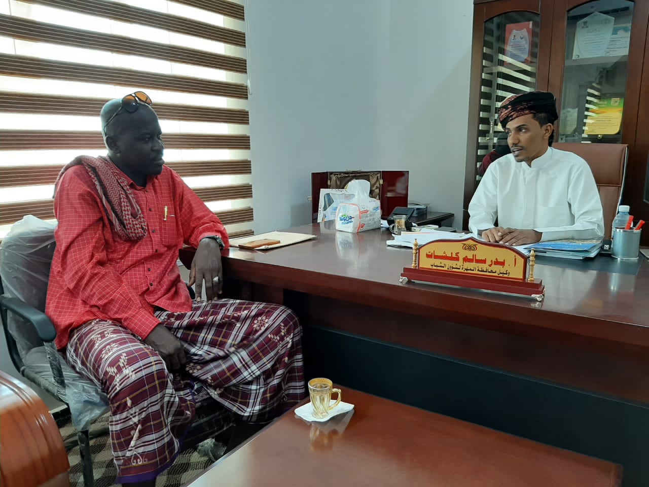 استقبل وكيل محافظة المهرة لشؤون الشباب الأستاذ بدر سالم كلشات، اليوم، بمكتبه، قيادة مفوضية الكشافة والمرشدات بمحافظة المهرة، للإطلاع على جهود الكشافة ومناقشة الخطط والبرامج الكشفية القادمة، والوقوف على الإشكاليات والعوائق لعمل المفوضية.