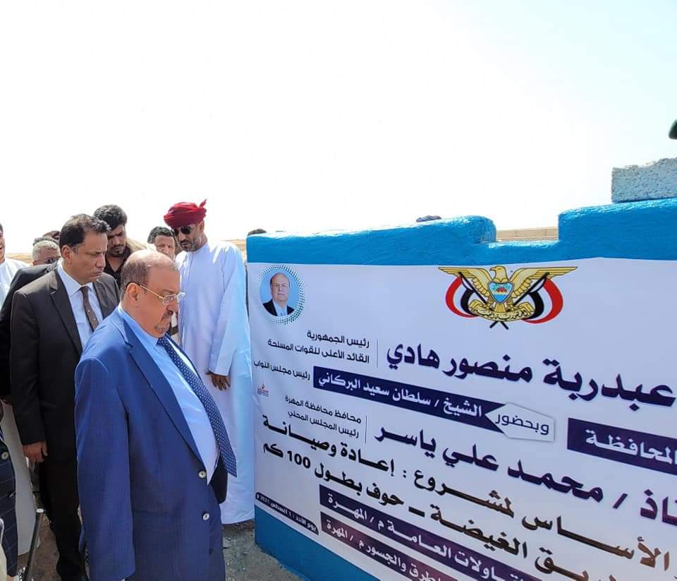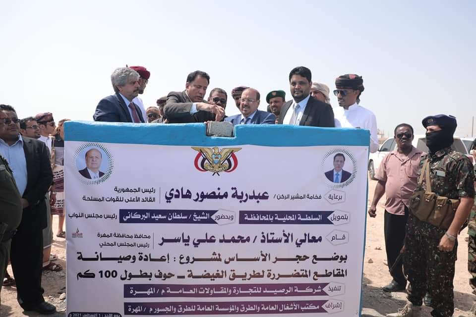 وضع رئيس مجلس النواب الشيخ سلطان البركاني ومعالي الأستاذ محمد علي ياسر محافظ محافظة المهرة، ووزير الكهرباء والطاقة الدكتور أنور كلشات، اليوم الأحد، حجر الأساس لمشروع إعادة وصيانة المقاطع المتضررة لطريق الغيضة_ حوف بطول 100 كم، تحت رعاية فخامة رئيس الجمهورية المشير عبدربه منصور هادي بتمويل من السلطة المحلية، وتنفيذ شركة الرصيد للتجارة والمقاولات العامة، وإشراف المؤسسة العام للطرق والجسور ومكتب الأشغال العامة والطرق.