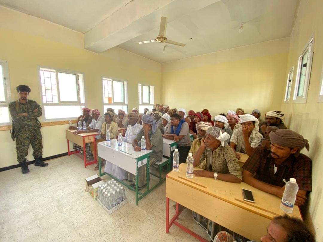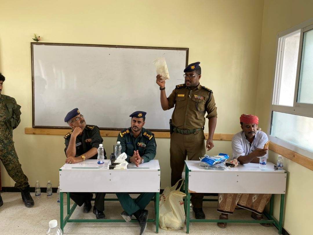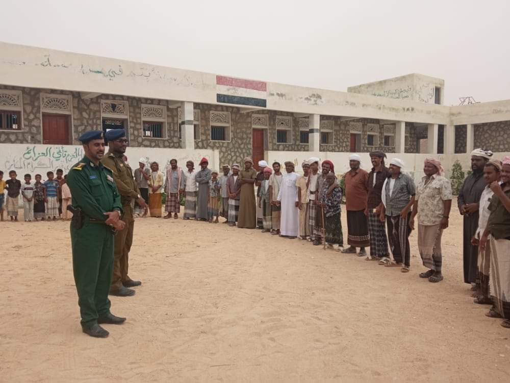 بعدها توجه نائب مدير الأمن والشرطة والفريق التوعوي الى احدى مدارس المديرية للقاء بشيوخ وأبناء المديرية واقامة ندوة توعوية حول المخدرات ومخاطرها.