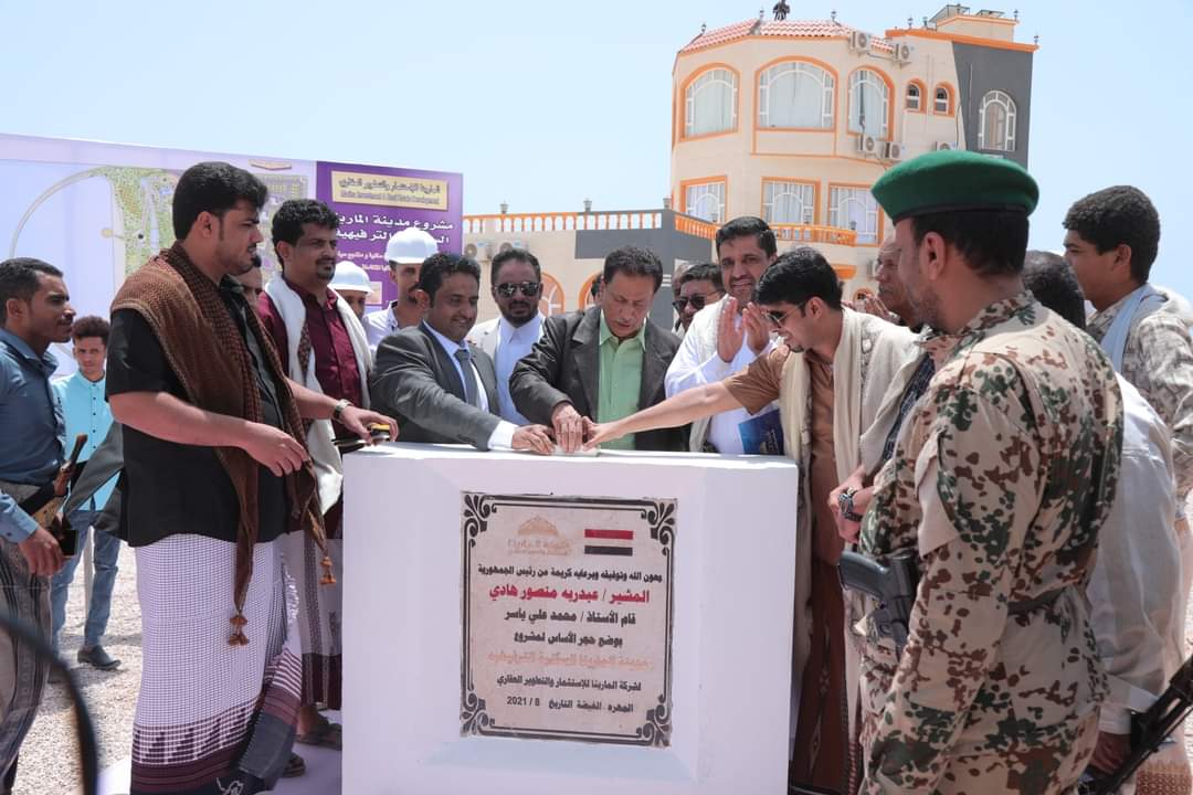 وضع معالي الأستاذ محمد علي ياسر محافظ محافظة المهرة، اليوم الإثنين، بمدينة الغيضة، حجر الأساس لمشروع مدينة المارينا السكنية الترفيهيه التابعة لشركة المارينا للإستثمار والتطوير العقاري، برعاية كريمة من رئيس الجمهورية المشير عبدربه منصور هادي.