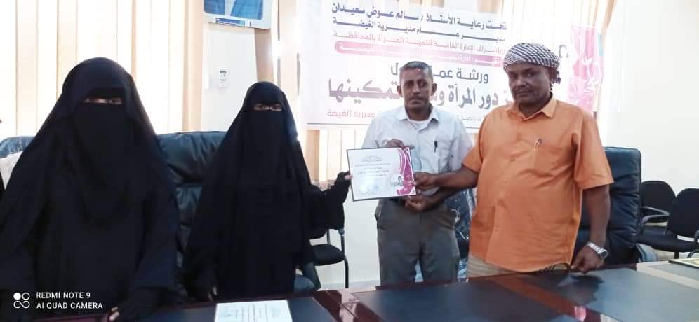 و في الختام خرجت ورشة العمل بعد مناقشات مستفيضة بعدد من التوصيات الهادفة، وجرى توزيع الشهادات التقديرية على المشاركات بحضور الأستاذ سالم عوض سعيدان مدير عام مديرية الغيضة، و مدير مكتبه الأستاذ محمد باشا عزي.