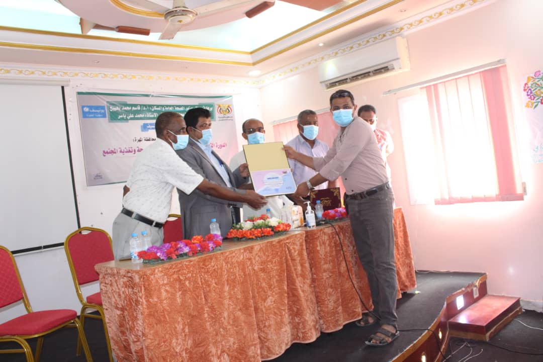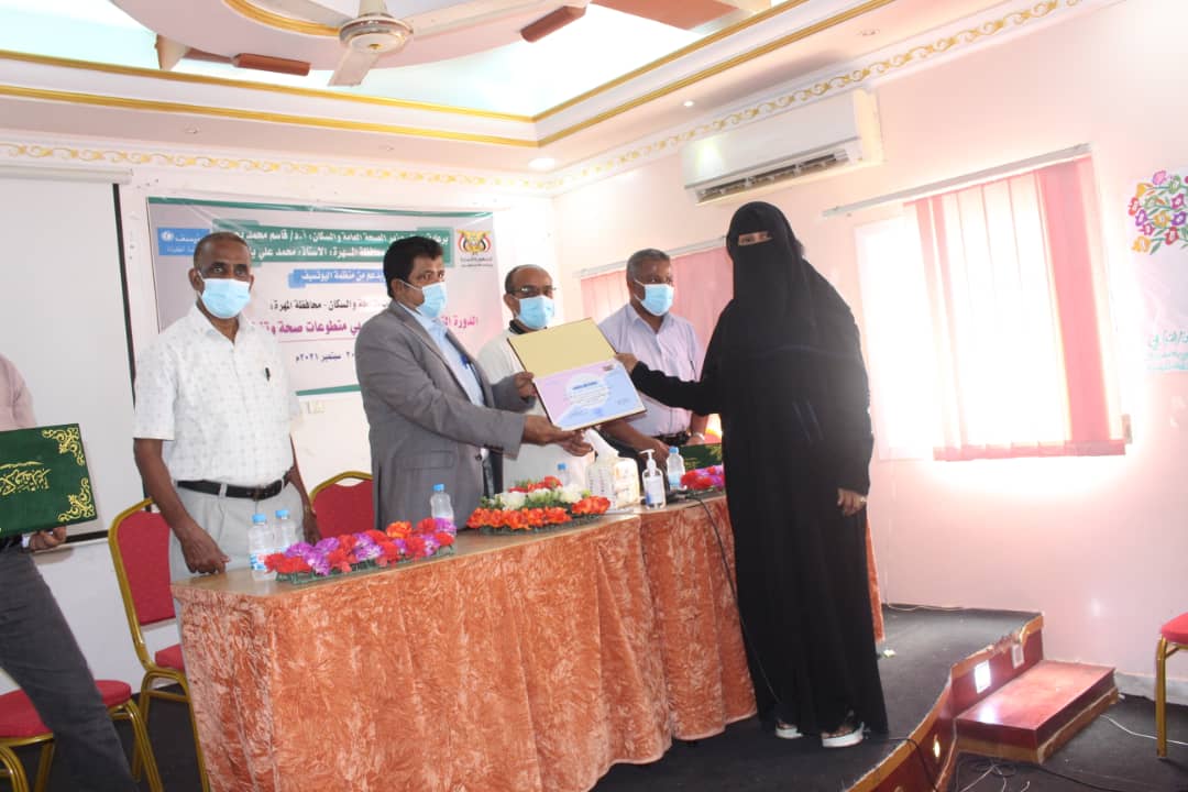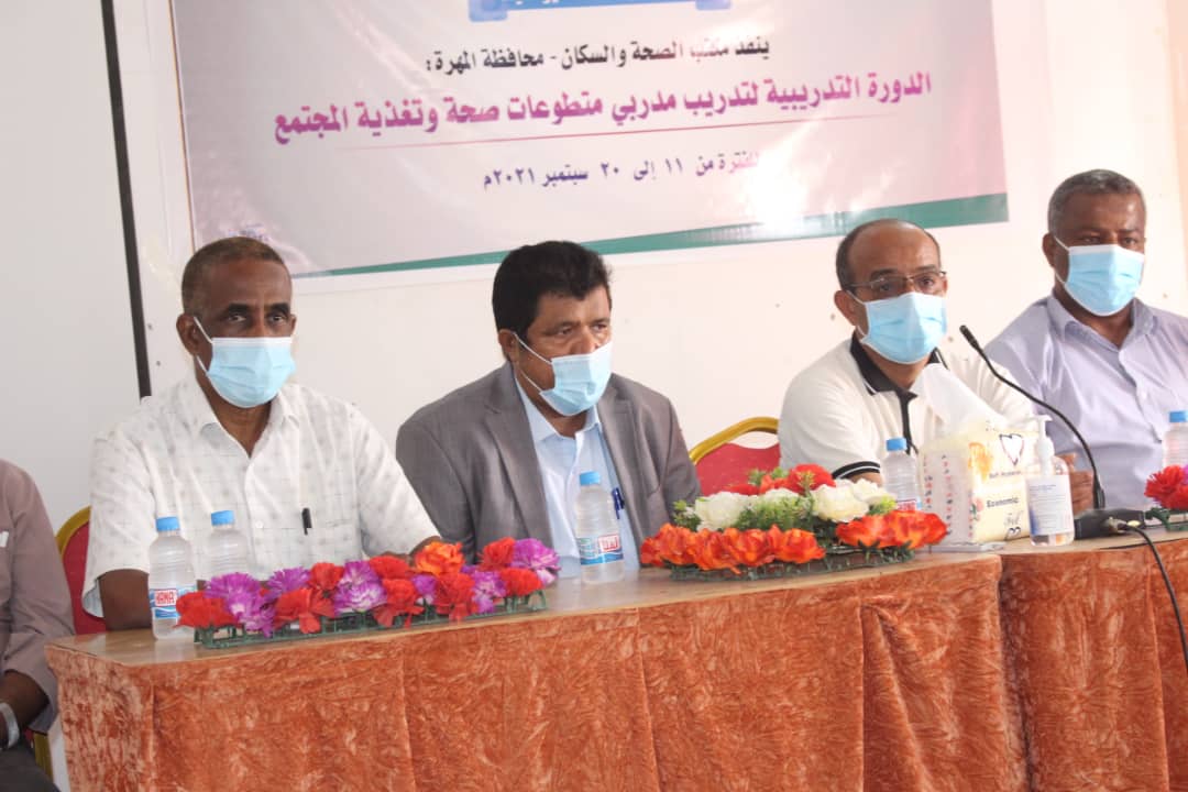 اختتم أمين عام المجلس المحلي بمحافظة المهرة الأستاذ سالم عبدالله نيمر، ومعه مدير عام مكتب الصحة والسكان بالمحافظة الدكتور عوض مبارك سعد، اليوم، دورة تدريب المدربين “TOT” لمتطوعات التغذية وصحة المجتمع، بدعم من منظمة اليونسيف، وتحت رعاية معالي وزير الصحة والسكان البروفسور قاسم محمد بحيبح، ومعالي الأستاذ محمد علي ياسر محافظ محافظة المهرة.
