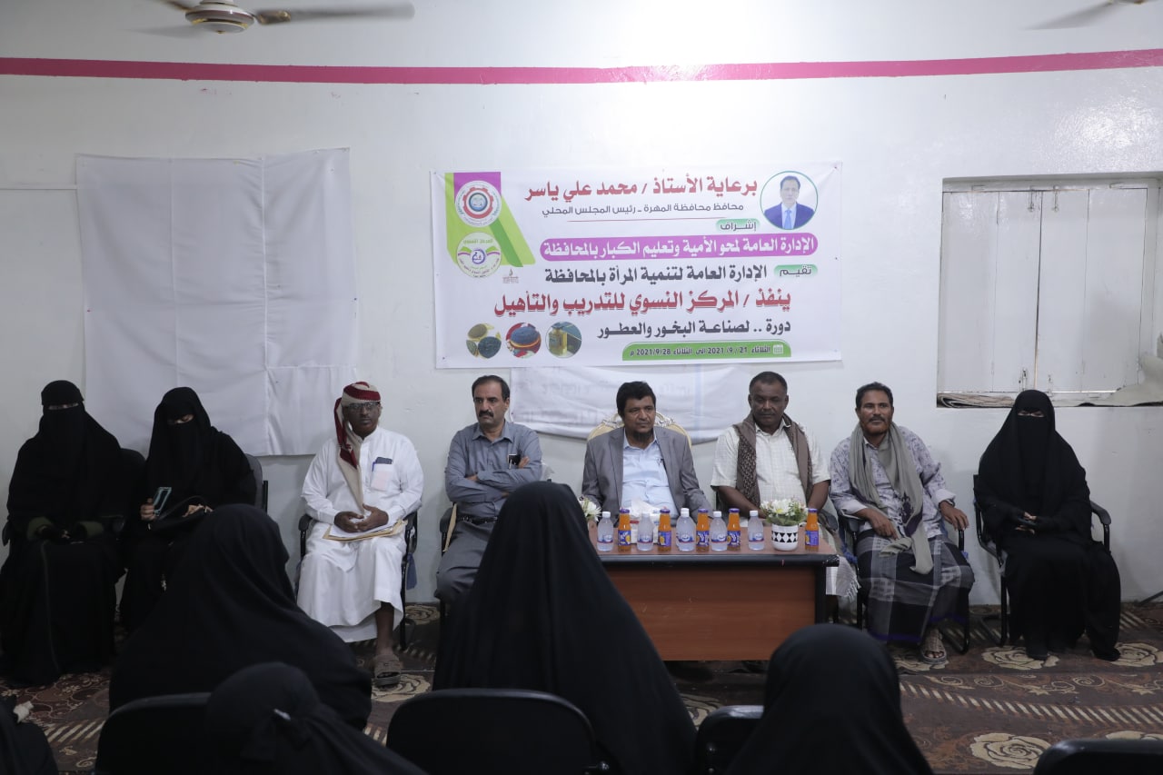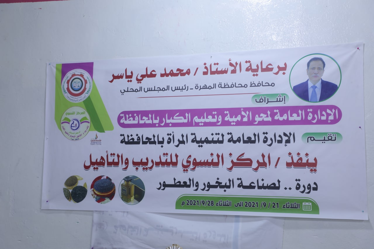 دشن الأمين العام للمجلس المحلي بمحافظة المهرة الأستاذ سالم عبدالله نيمر صباح اليوم دورة تدريبية في صناعة البخور والعطور ، برعاية معالي الأستاذ محمد علي ياسر محافظ محافظة المهرة واشراف الادارة العامة لمحو الامية وتعليم الكبار بالمحافظة والادارة العامة لتنمية المرأة بالمحافظة وتنفيذ المركز النسوي للتدريب والتأهيل .