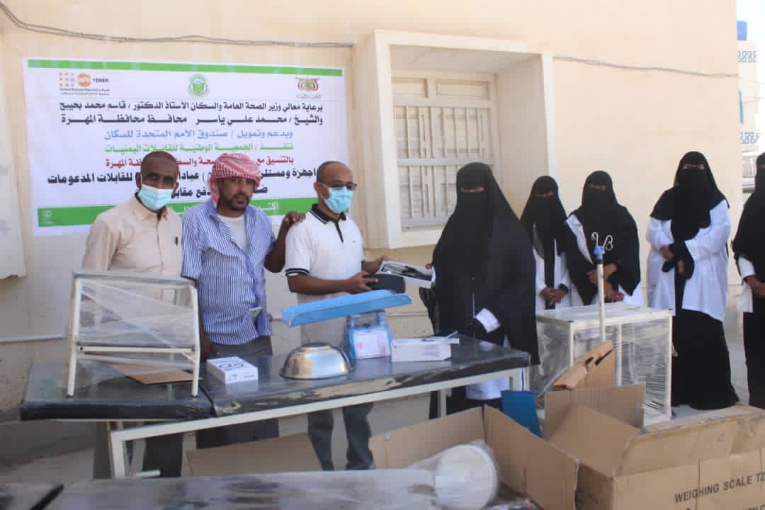 دشن مدير عام مكتب الصحة العامة والسكان بمحافظة المهرة الدكتور عوض مبارك سعد اليوم، توزيع أجهزة ومستلزمات طبية للعيادات المنزلية لقابلات المجتمع تنفيذ الجمعية الوطنية للقابلات اليمنيات وبدعم من صندوق الأمم المتحدة للسكان بالتنسيق مع مكتب وزارة الصحة العامة والسكان بالمحافظة.