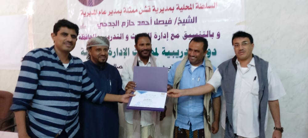 جاء ذلك خلال كلمته اليوم في حفل اختتام فعاليات الدورة التدريبية الأولى استهدفت كوادر وموظفي المكاتب الحكومية بالمديرية على مدى أسبوع كامل بمشاركة أكثر من أربعين موظف من مختلف المكاتب والمصالح الحكومية بهدف تزويدهم بمهارات الإدارة الحديثة.