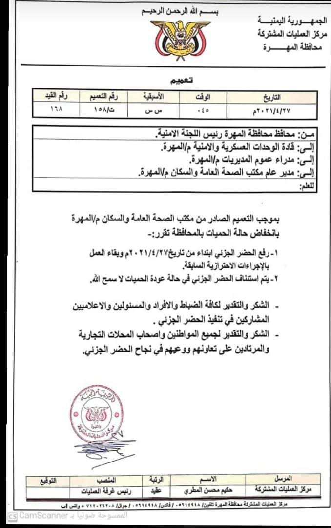 أقرت اللجنة الأمنية بمحافطة المهرة، في تعميم موجه للأخوة قادة الوحدات العسكرية والأمنية ومدراء عموم المديريات ومدير عام مكتب الصحة، رفع الحظر الجزئي ابتداءً من اليوم الثلاثاء 27/ابريل /2021م، استنادا للتعميم الصادر من مكتب الصحة والسكان بالمحافظة بشأن انخفاض حالة الحميات، على أن يبقى العمل والتقيد بالإجراءات الاحترازية المقرة سابقاً للحد من تفشي وباء كورونا والحميات الفيروسية وحفاظا على السلامة العامة للمواطنين.