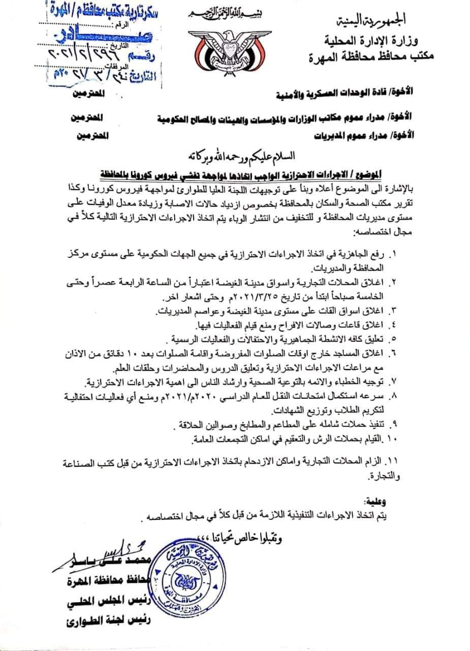 محافظ المهرة يصدر تعميمًا بتنفيذ الحظر الجزئي على الأسواق التجارية وإجراءات أخرى ضمن الإجراءات الاحترازية لمواجهة تفشي فيروس كورونا