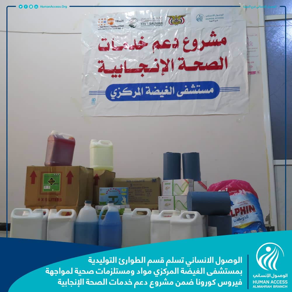 الوصول الإنساني فرع المهرة تسلم قسم الطوارئ التوليدية مواد ومستلزمات صحية لمواجهة فيروس كورونا المستجد