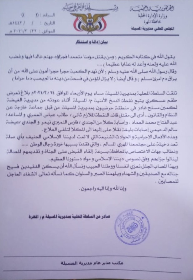 أصدرت السلطة المحلية بمديرية المسيلة، مساء اليوم الجمعة، الموافق 26/مارس/2021م، بيان إدانة واستنكار للحادث الإجرامي الشنيع الذي تعرض له الطقم العسكري التابع لنقطة الدمخ الأمنية، مساء الأربعاء 24/مارس/2021م
