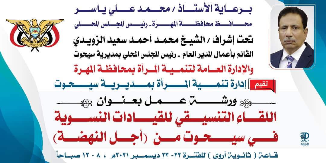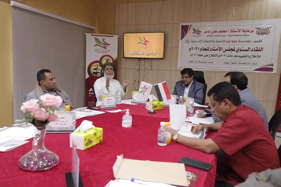 عقد مجلس الأمناء بمحافظة المهرة، اليوم، اللقاء السنوي لتقيم مشاريع مؤسسة مؤسسة فينا خير للتنمية والأعمال الإنسانية، خلال العام 2021م الذي أوشك على الإنتهاء وللإطلاع على خطة المؤسسة للعام المقبل 2022 ،الذي يأتي برعاية محافظ المحافظة الأستاذ محمد علي ياسر.