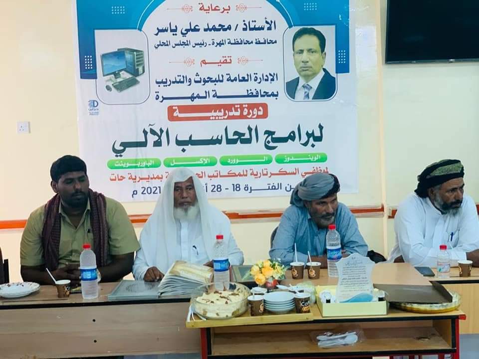 كما دشن الأمين العام للمجلس المحلي دورة تدريبية في مجال العمليات الحسابية باستخدام الحاسب الآلي لموظفي الديوان، تقيمها الإدارة العامة للمعلومات والإحصاء والتوثيق ، والإدارة العامة للبحوث والتدريب، برعاية الأستاذ محمد علي ياسر محافظ محافظة المهرة.