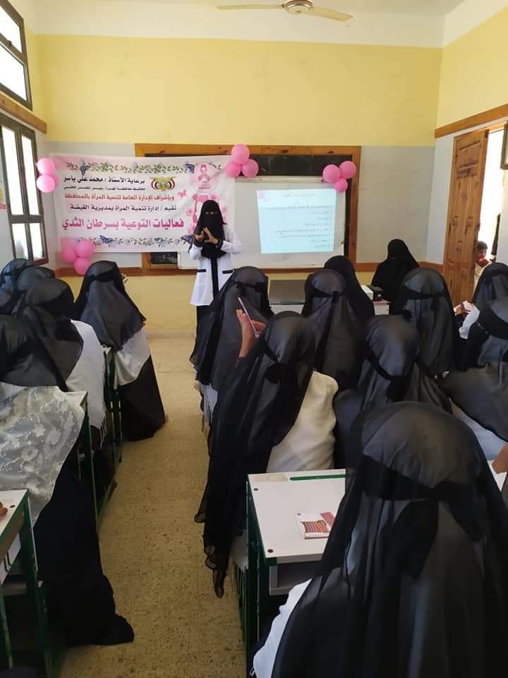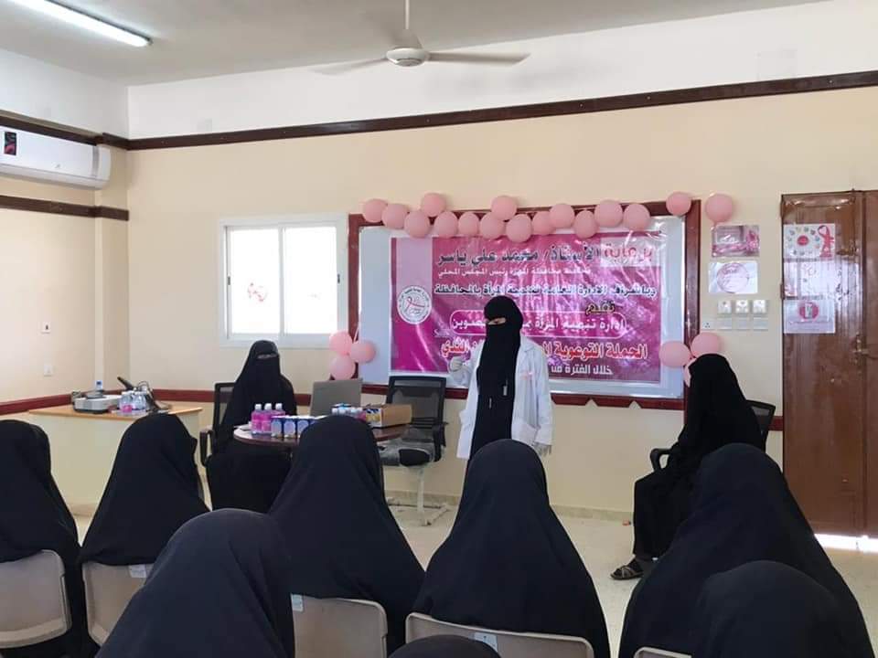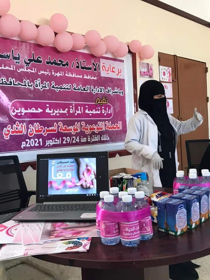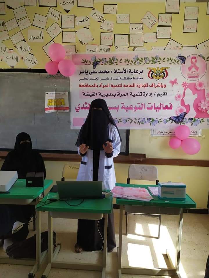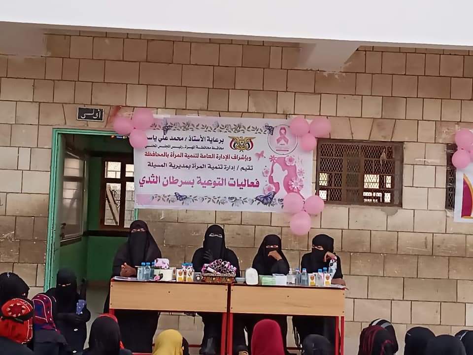 أقامت إدارة تنمية المرأة بمديرية المسيلة، صباح اليوم، الخميس، فعاليات التوعية بسرطان الثدي، برعاية كريمة من معالي الأستاذ محمد علي ياسر محافظ محافظة المهرة، و إشراف الإدارة العامة لتنمية المرأة بالمحافظة، وبالتنسيق مع السلطة المحلية بمديرية المسيلة، ومكتب التربية والتعليم بالمديرية.