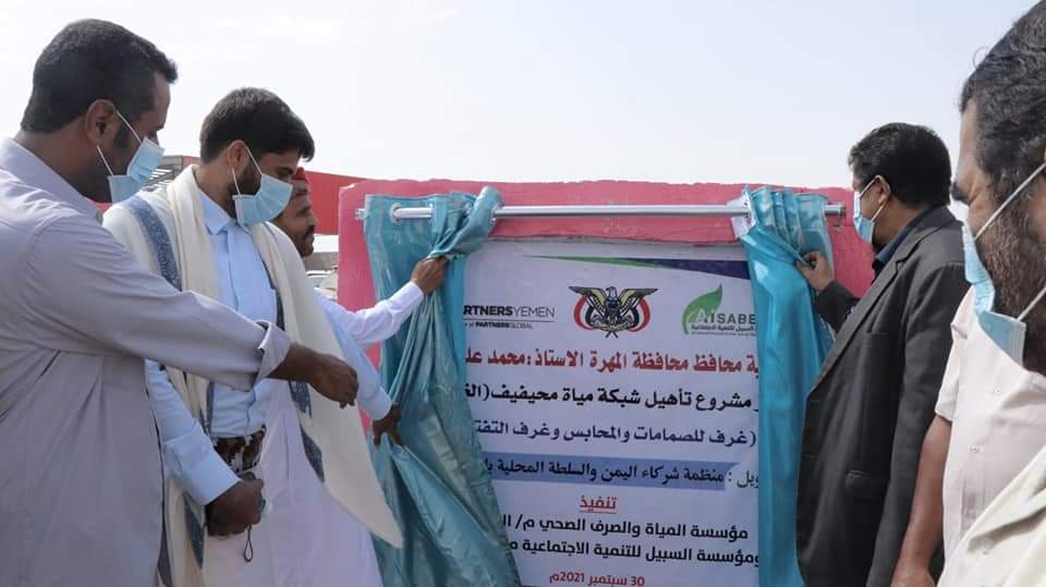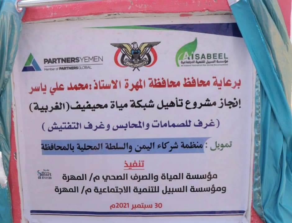 أزاح الأمين العام للمجلس المحلي بمحافظة المهرة، اليوم الخميس، الستار بعد إنجاز مشروع تأهيل شبكة مياة محيفيف ( الغربية) بتمويل من منظمة شركاء اليمن والسلطة المحلية، وتنفيذ مؤسسة المياه والصرف الصحي م/ المهرة ومؤسسة السبيل للتنمية الاجتماعية.
