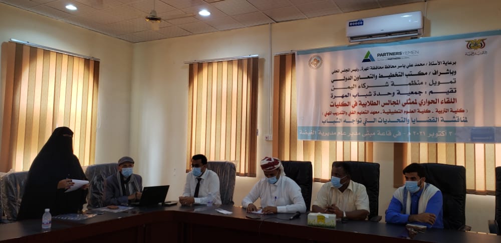 أقامت جمعية وحدة شباب المهرة، اليوم، اللقاء الحواري لممثلي المجالس الطلابية في الكليات بمديرية الغيضة لمناقشة القضايا والتحديات التي تواجه الشباب ، برعاية الأستاذ محمد علي ياسر محافظ محافظة المهرة وبإشراف مكتب التخطيط والتعاون الدولي وتمويل منظمة شركاء اليمن.